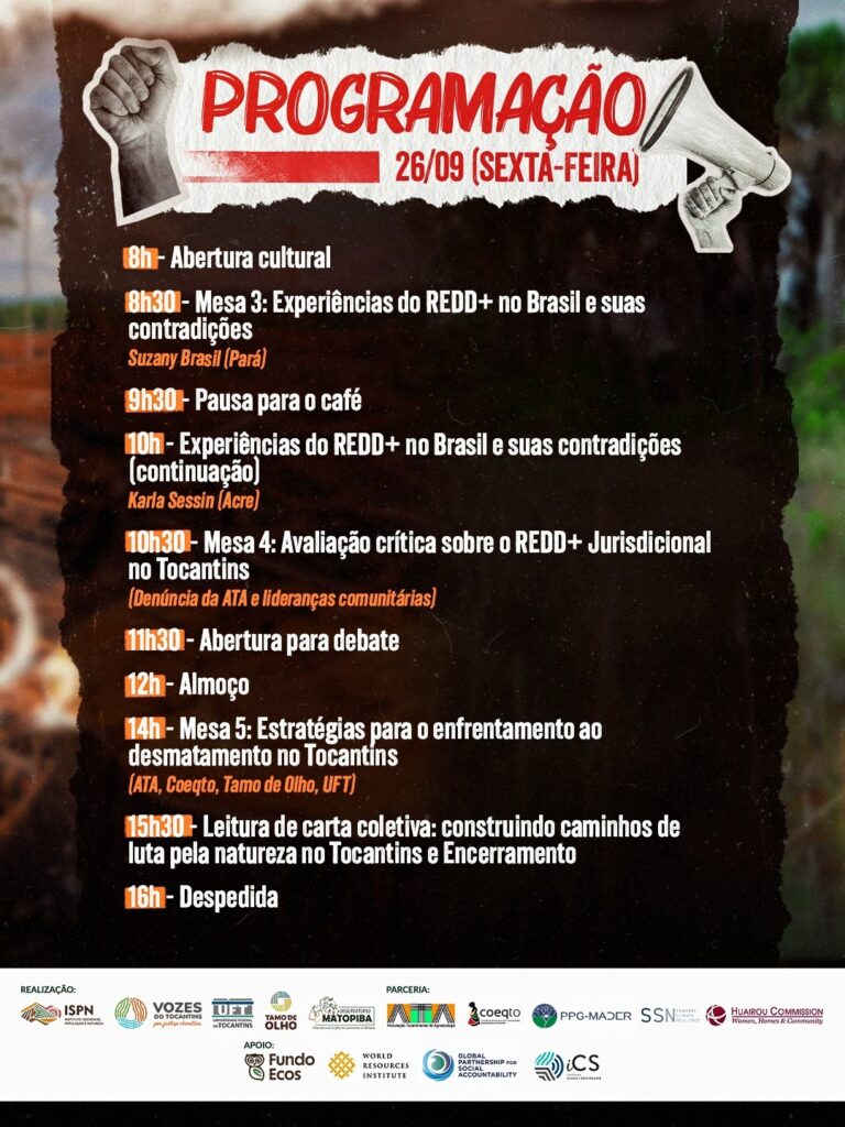 O evento também debaterá a condução do Programa de REDD+ Jurisdicional do Tocantins. Esse é um mecanismo de compensação internacional de carbono, defendido pelo Governo do Estado como solução para conter o desmatamento. Experiências relatadas em estados como Acre e Pará, contudo, indicam problemas de transparência e diálogo com as comunidades locais.