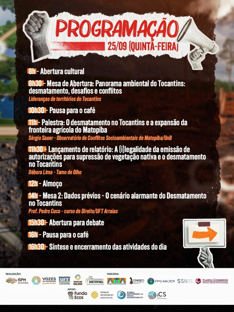 O evento está com as inscrições abertas e é uma realização do Instituto Sociedade, População e Natureza (ISPN), Coalizão Vozes do Tocantins por Justiça Climática, Centro de Assessoria às Comunidades Tradicionais do Tocantins (CACTTO/UFT), Tamo de Olho e Observatório do Matopiba em parceria com a Associação Tocantinense de Agroecologia (ATA), Coordenação Estadual das Comunidades Quilombolas do Tocantins (Coeqto), e a Pós-graduação em Meio Ambiente e Desenvolvimento Rural (PPGMader/UnB). São apoiadores do evento o Fundo Ecos, World Resources Institute (WRI) e o Instituto Clima e Sociedade (iCS).